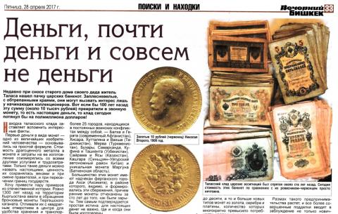 При сносе старого дома своего деда, житель Таласа нашел пачку царских банкнот. Заплесневелые, с обтрепанными краями они могут вызвать интерес лишь у начинающих коллекционеров. Вот, если бы 100 лет назад эту сумму (около 10 000 рублей) превратили в звонкую монету, то есть настоящие деньги, то клад сегодня потянул бы на полмиллиона долларов.