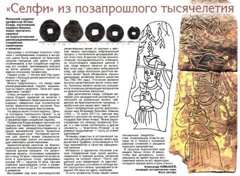 Бронзовая с остатками позолоты пластина с изображением согдийца в вычурной шапке была найдена на Краснореченском городище уже давно и даже опубликована, а вот согдийскую надпись над его головой, принимаемую вначале за ветки дерева, удалось прочитать японскому профессору. Первое слово — персональное имя «Нау-руан», второе частично попавшее в обрез с большой долей вероятности восстанавливается как «друг». Отталкиваясь от современных представлений можно предположить, что перед нами раннесредневековый портрет, вырезанный на память приятелю. Если средневековое «селфи» может представлять интерес из-за необычного головного убора, то новое прочтение легенд на согдийских монетах, сделанные японским профессором, вносят существенные изменения в историю Кыргызстана.