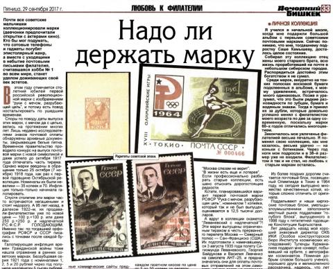 На просторах Интернета, особенно коммерческие сайты, предлагают филателистические раритеты по ценам в рублях с тремя и более нулями и несведущие в тонкостях филателии лелеют надежду, что их детские коллекции имеют определенную стоимость. К сожалению, приходиться разочаровывать большинство наследников филателистических коллекций и открыть небольшой секрет, что в 70-80–х годах гашеные почтовые марки, в том числе и социалистических стран, продавались в каждом газетном киоске по цене от 3 до 20 копеек за десяток. За прошедшие годы цена их возросла незначительно, а с учетом того что филателистов в Бишкеке можно пересчитать по пальцам, найти покупателя на них сложно. Одно время советские марки пользовались ажиотажным спросом у жителей Поднебесной, но сегодня китайцы интересуются старыми марками только своей страны.