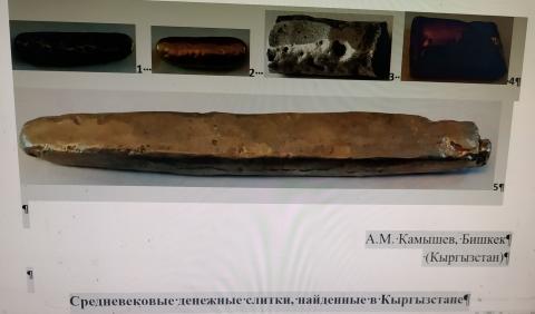 Случайная находка осенью 2018 г. серебряного слитка на юго-восточной окраине Бишкека (городище Кара-Джигач XI-ХIV вв., ассоциируется с легендарным Тарсакентом) пополнила разновидности денежных знаков. Вытянутая брусковидная форма слитка длиной 133 мм и сечением 17х10 мм. позволяла отделять кусочки определенного веса, что дает основания предполагать об использовании его при денежных расчетах (фото 5).